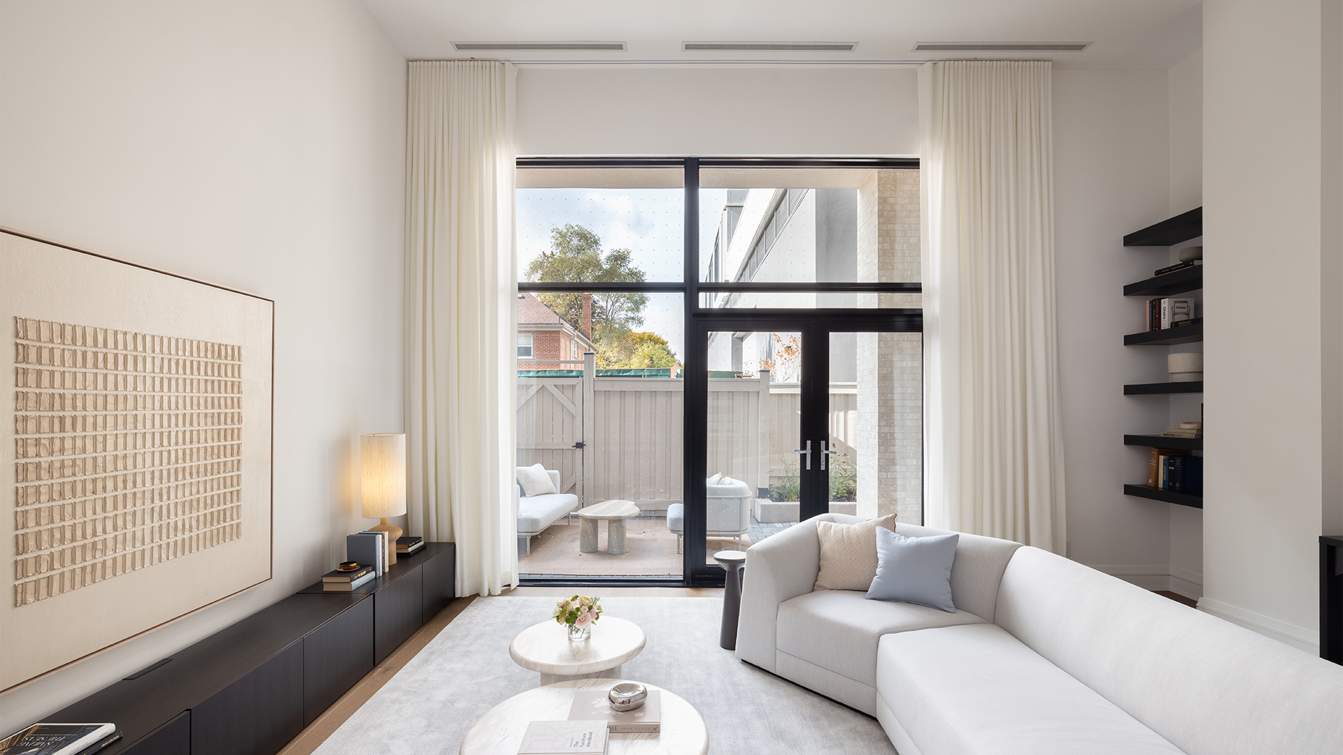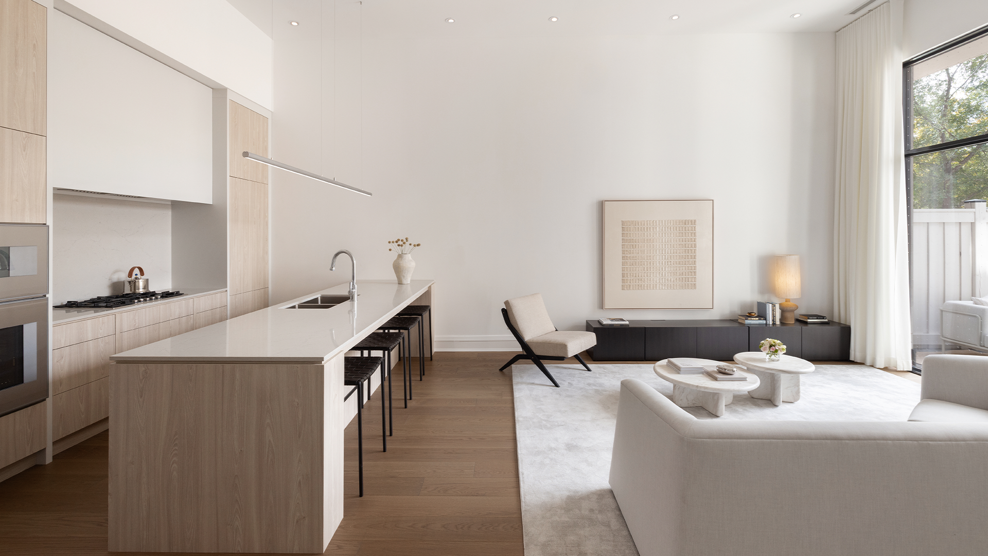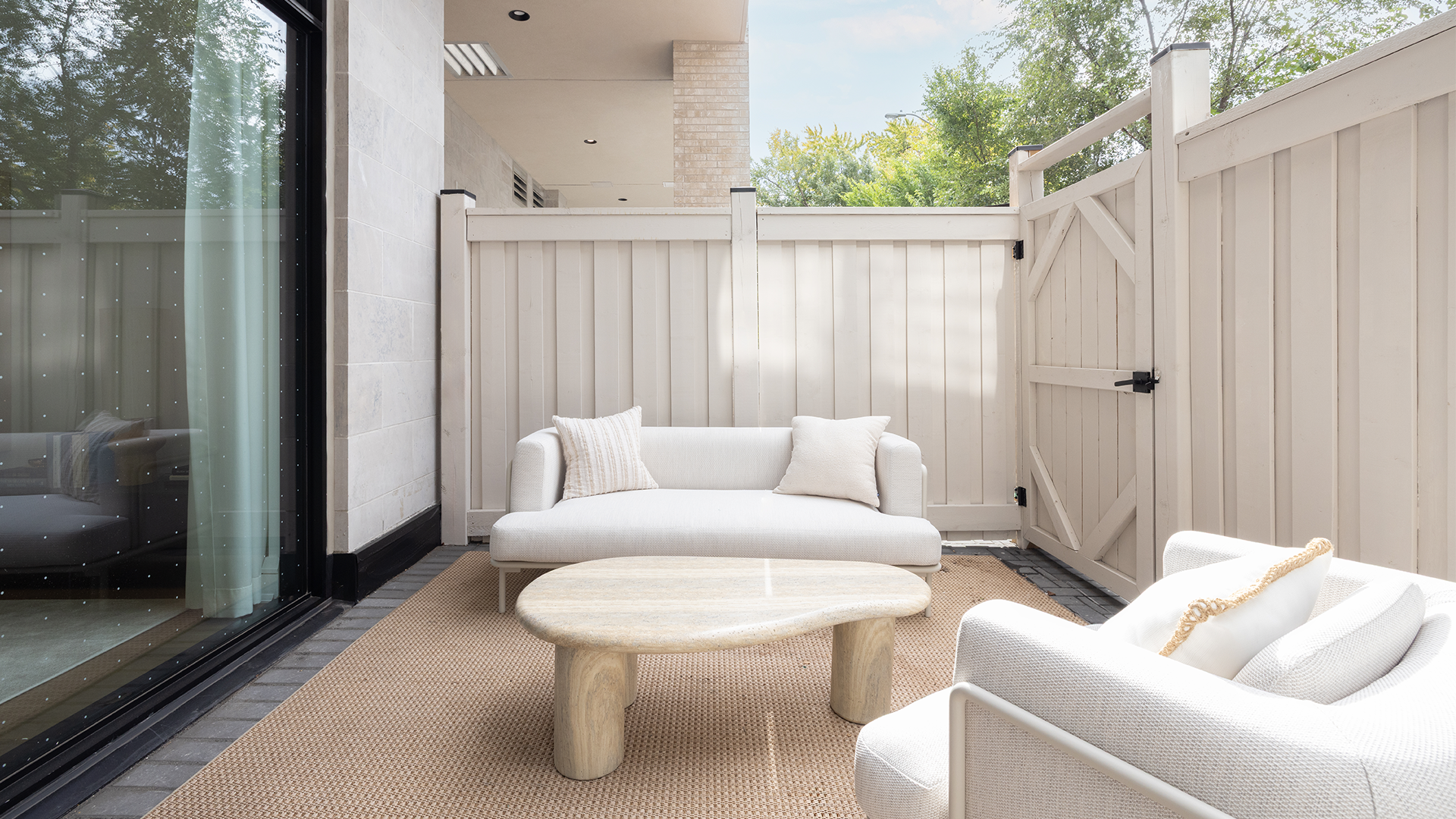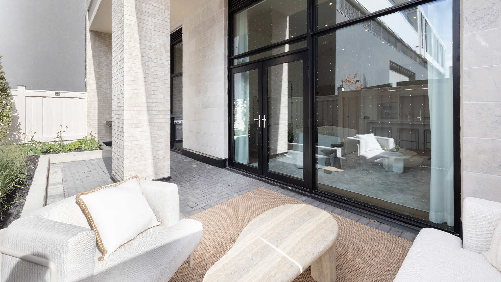 Upon stepping through the lobby doors, of The Rhodes, you’ll feel like this is a condo-building like no other. Opening the doors to the expansive one-bedroom plus den condo, only confirms your suspicions. It’s truly a one-of-a-kind gem in a boutique building nestled between midtown Toronto’s Forest Hill and Cedarvale neighbourhoods. Stepping outside you’ll find an outdoor retreat – like an entertaining patio with a natural gas BBQ and a flower garden. Inside you’ll find soaring 12-foot ceilings, recessed lighting, and 7-inch engineered wood floors set an elegant tone underfoot. The custom-designed kitchen features high-end appliances, quartz countertops, and an oversized island for five. The open-concept layout flows seamlessly into a bright living and dining area with bespoke built-ins, perfect for entertaining or working from home. Residents enjoy five-star amenities including a state-of-the-art fitness studio, pet spa, and rooftop terrace. This condo blends serene luxury with unmatched urban convenience.